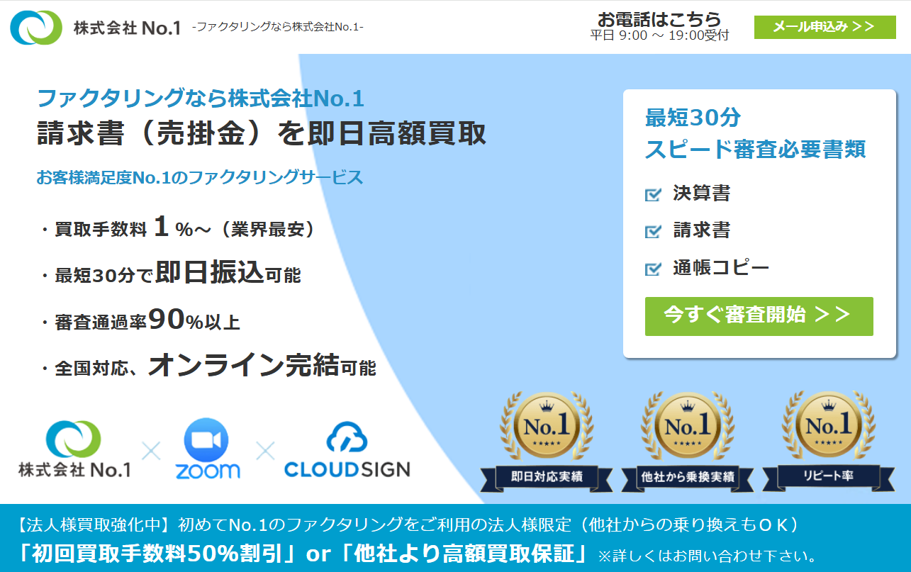 株式会社No.1は、累計8,000件超の実績を持つファクタリングサービスです。手数料は1%~と業界の中でも低く、法人向けの特典を利用すればさらに負担を抑えられます。